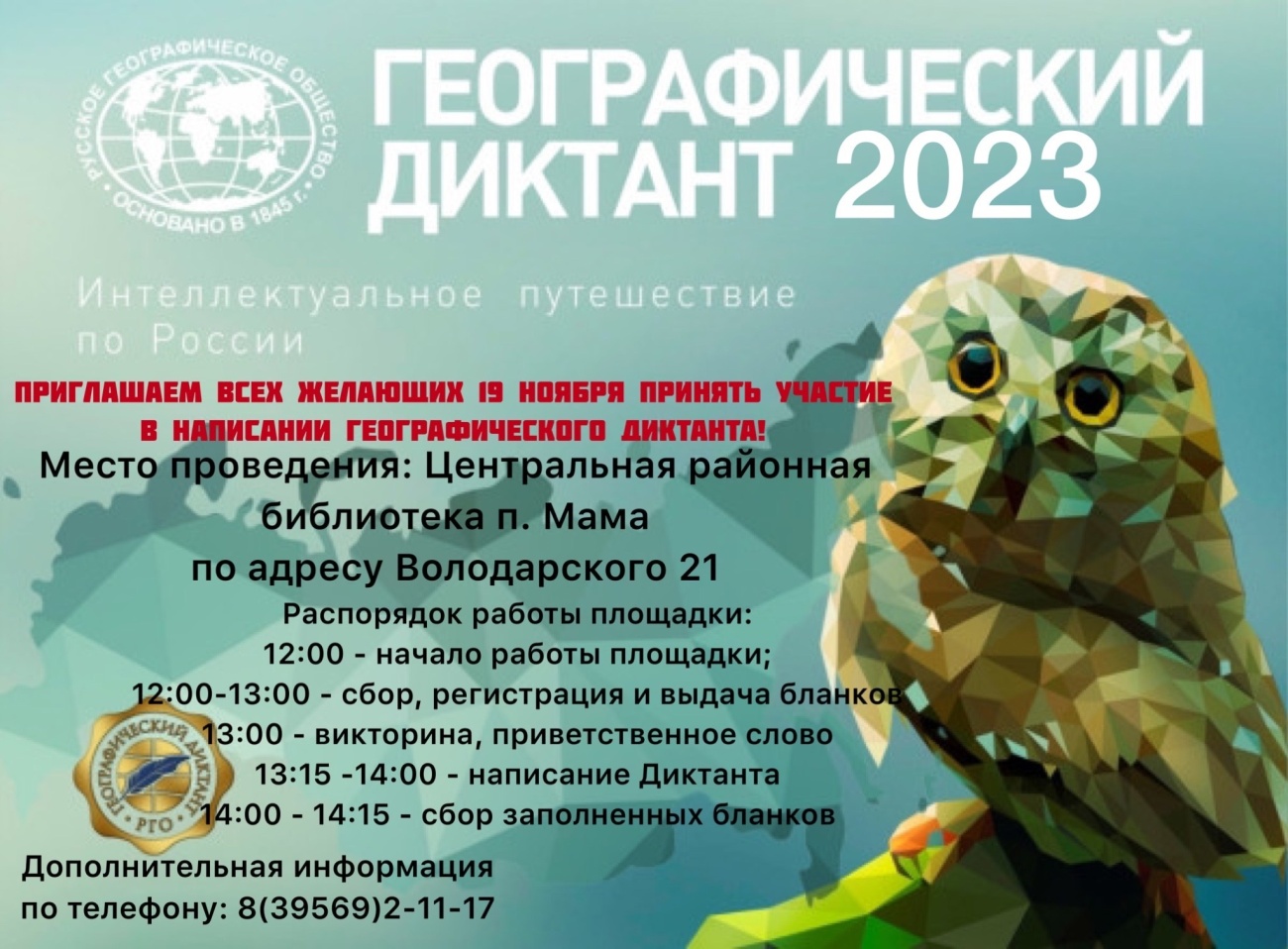Приглашаем всех принять участие! Географический диктант – 2023 состоится 19 ноября. Место проведения: МКУК «ЦБС Мамско – Чуйского района – ЦРБ»,