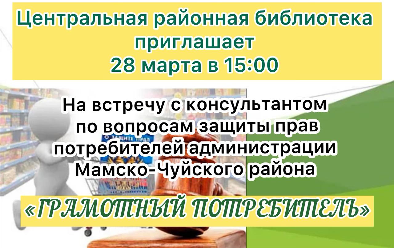 *В Иркутской области стартовал месячник защиты прав потребителей.* Центральная районная библиотека приглашает всех желающих *28 марта в 15:00* на встречу *«Грамотный потребитель»* с консультантом по вопросам защиты прав потребителей администрации Мамско-Чуйского района. Встреча проводится в целях повышения качества и культуры обслуживания населения наших жителей в сфере торговли, общественного питания и бытового обслуживания, содействия правовому просвещению граждан в области защиты прав потребителей.