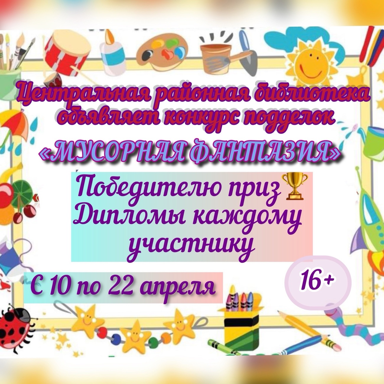 Центральная районная библиотека объявляет экологический конкурс подделок «Мусорная фантазия» посвященный Международному Дню Земли???? к участию в конкурсе приглашаем жителей и организации Мамско-Чуйского района. Конкурс проводится с 10 по 22 апреля. Подробности конкурса можете узнать из положения! Проявите свою фантазию, принимайте активное участие????